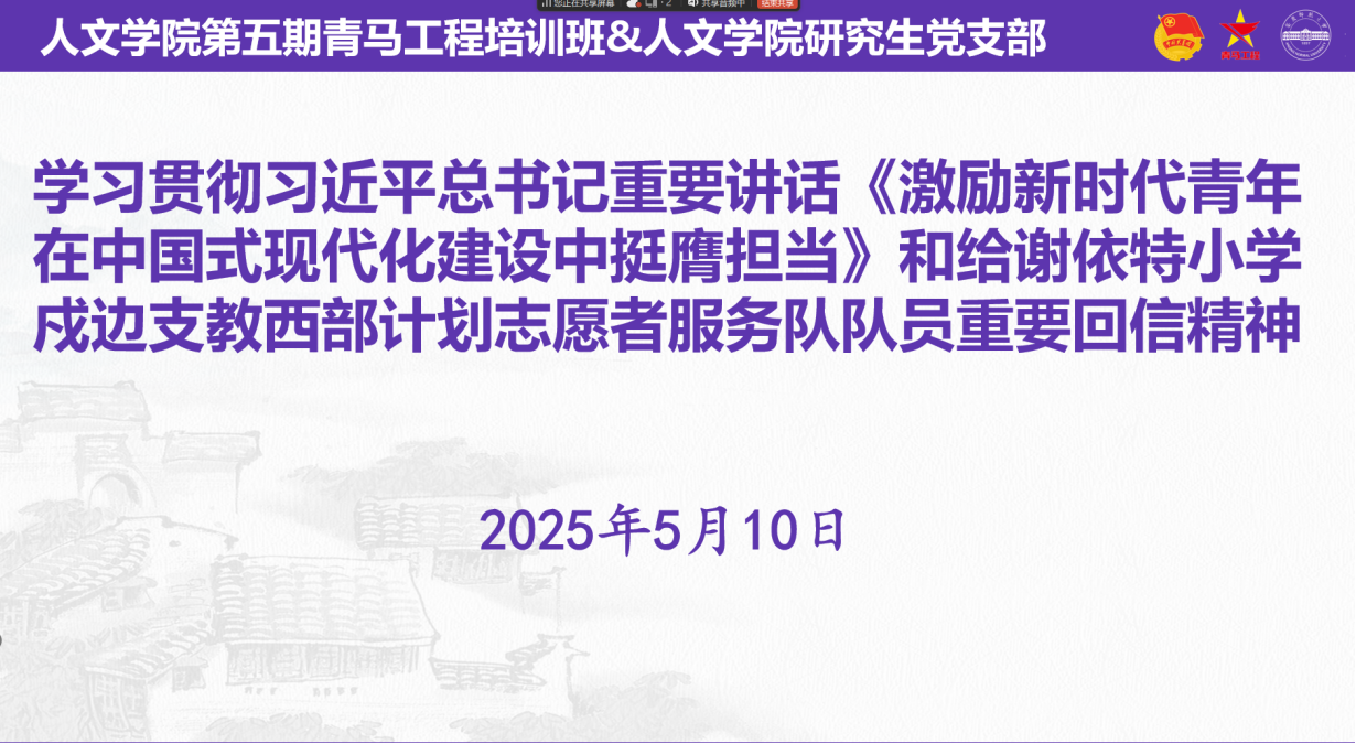 5月10日,太阳成集团tyc9728研究生党支部与第五期青马工程培训班举行线上会议,学习贯彻习近平总书记给谢依特小学戍边支教西部计划志愿者服务队队员重要回信精神,并邀请2021年西部计划志愿者、2024级学科教学(历史)专业程添星同学进行经验分享。