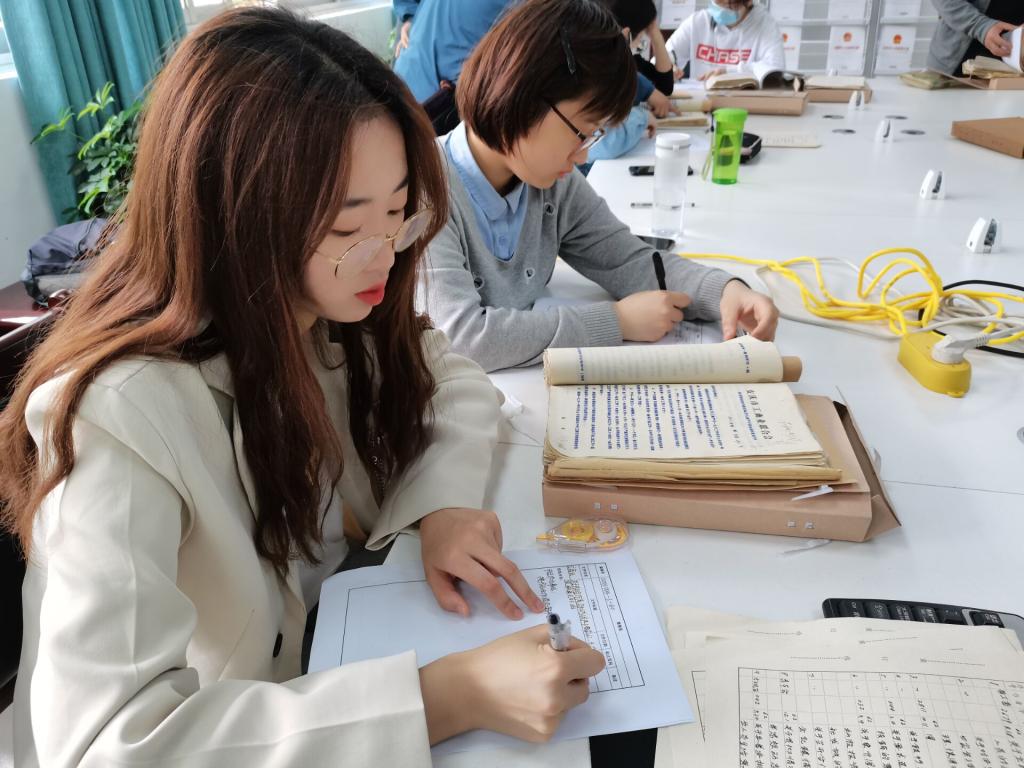 案卷号、案卷名、档案内容……员工们两两一组,仔细根据档案目录进行查找、在确认无误后才开始誊抄。历史学专业2019(1)班的霍嘉琪是第二批前来安庆市档案馆的员工,根据这次“建国初期三大改造”的学习主题,她选择从工商业的方面切入,抄录了“安庆胡玉美蚕豆酱的调查”的相关信息,并计划再深入了解中国共产党在全国范围内开展社会主义三大改造的详细情况。