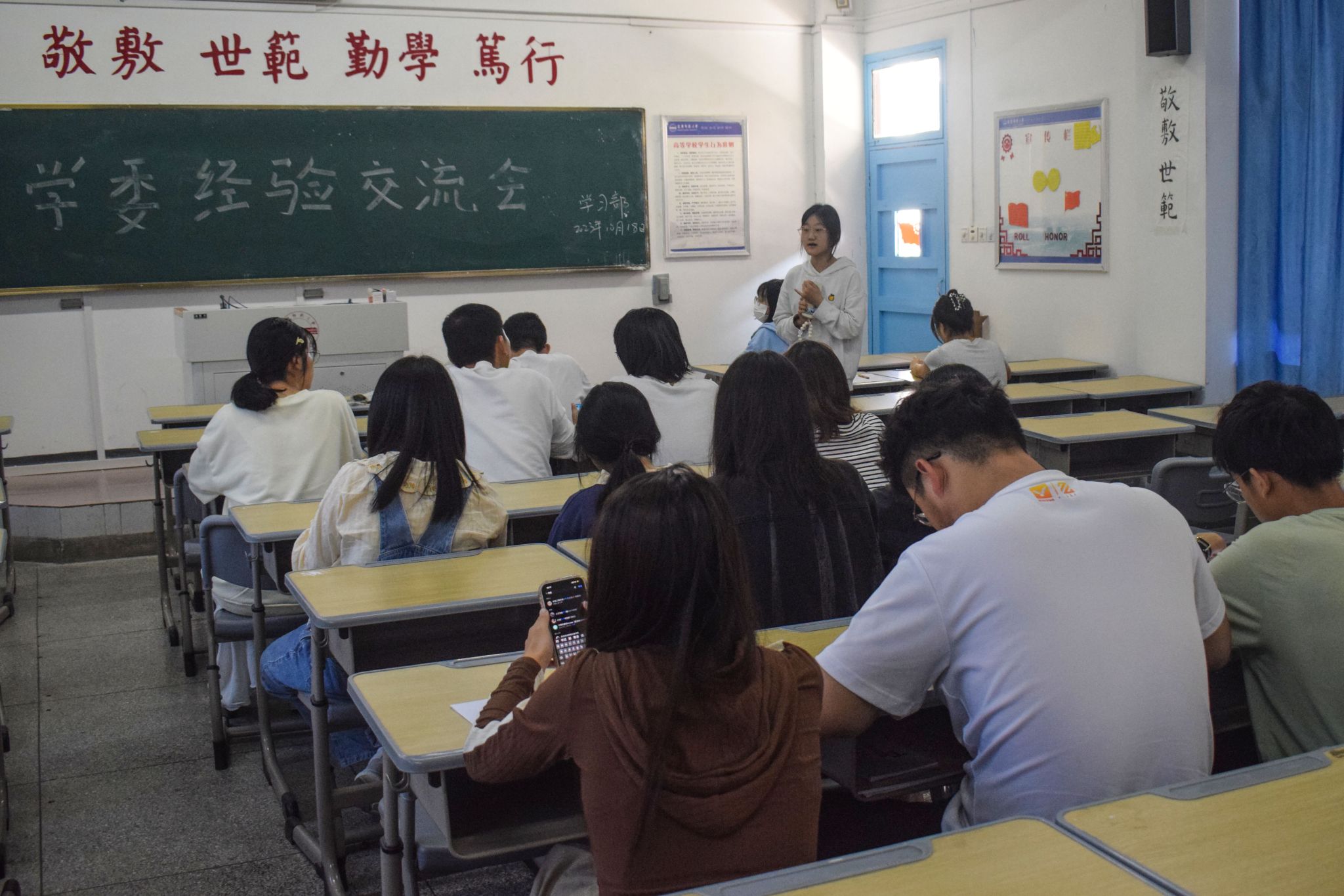 2021级汉语言文学专业的学习委员余萌同学向从日常工作角度出发,给新生学习委员分享了自己的经验,她说道:“学委们在应掌握投影仪等电子设备的使用,在日常学习中督促同学们认真完成作业,做好班级考勤工作。”余萌表示做好学委工作,离不开学委自身沟通能力的提高,要求学委及时准确地传达老师的信息,善于和同学们进行有效沟通,做好班级学习委员的上传下达工作。
