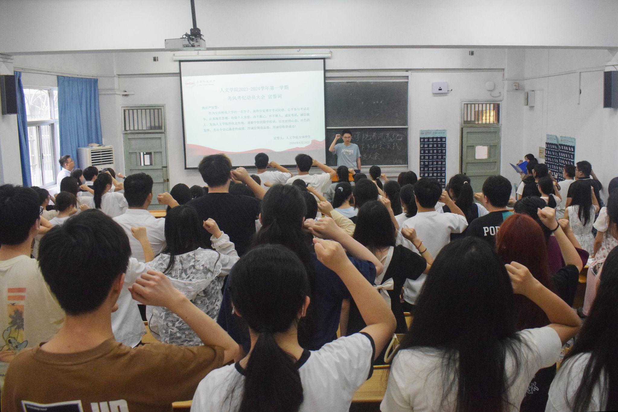2023级中国语言文学类专业八班的程子俊和2023级历史专业三班的詹鸿畅以诚信名言为引,号召大家坚守诚信,自觉抵制任何形式的作弊行为,展现出老员工应有的风采和道德规范。在学习部负责人宣昕的带领下,全体成员起立并高举右拳,共同宣读考风考纪宣誓词,自觉遵守考试纪律,公平参与考试竞争。