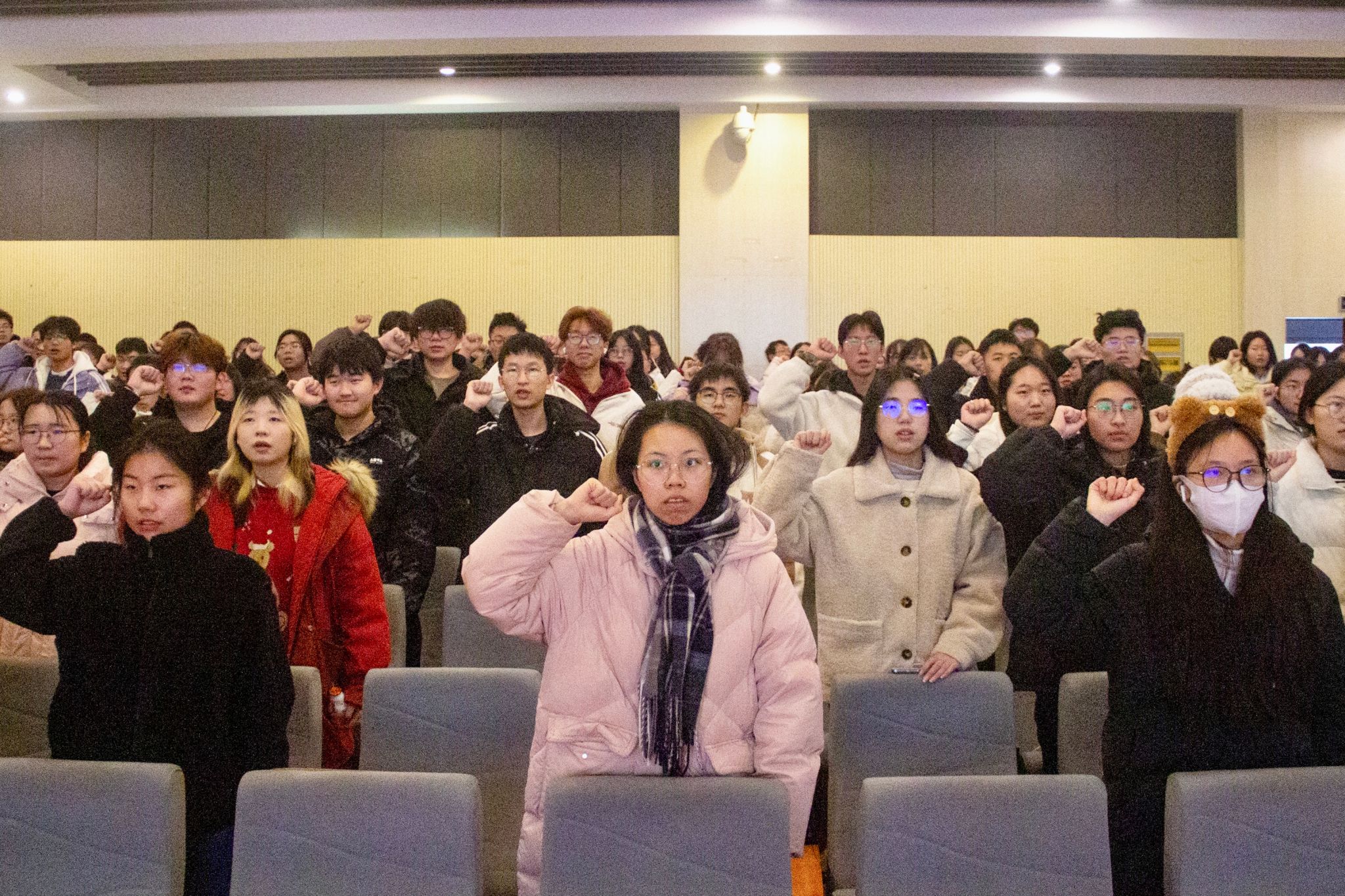 会议伊始,参会员工们在有“端正考风 严肃考绩 振奋精神 考出水平”字样的红色横幅上签字。学习部朱宇恒同学带领全体员工做出诚信考试的庄严宣誓。员工代表2024级文典班司佳宁上台发言,她表示,要严肃考风考纪,争做文明考生。