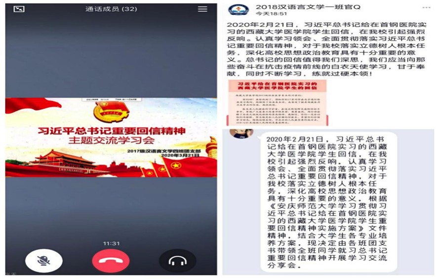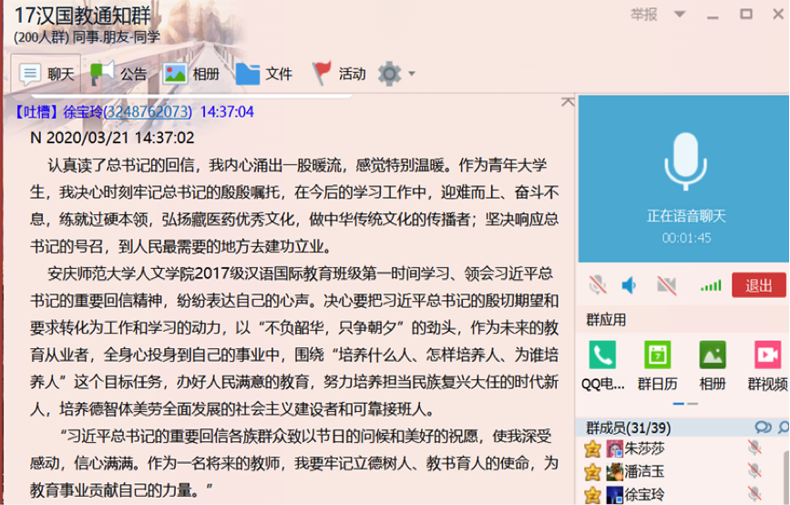 在学习分享活动中,许多同学分享了自己的看法和观点。2019级汉语言文学1班的宫金婷同学认为,新时代的广大青年应该立足基层,扎根人民群众,努力成为国家发展、社会进步、民族富强奠定强大的后备力量。2019级研究生赵莉同学说,作为老员工,我们应当发挥自己的专业特长和力量,积极帮助基层工作人员进行防疫防控工作,做好防疫工作宣传,承担起我们作为公民的责任。