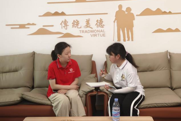 (图为实践团成员与龙山养老院工作人员杭沁沁交流)