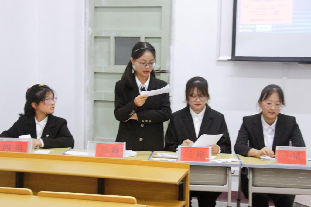最后主持人王琬琦总结了比赛情况,提出表演赛中存在的问题,重申比赛会场要求和比赛纪律,对正式比赛选手进行答疑解惑。她指出:“选手在正式比赛时应注意比赛礼仪,不要因情绪激动就用手指指向对方辩手,会影响打分。”