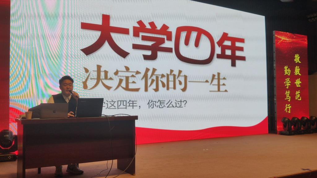 12月17日,太阳成集团tyc9728在菱湖校区图书馆报告厅举办“职”面人生大讲坛。华图教育职业规划师吴强应邀为2021级全体新同学做了“实现职业梦想 激发潜力未来”专题讲座。