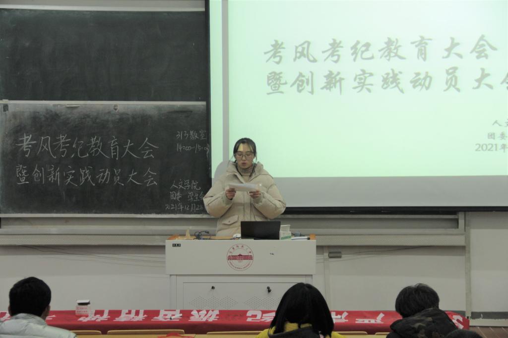 会上,2021级中国语言文学六班王安琦同学代表全院学子发出诚信考试倡议:认真复习,积极备考;严于自律,立己达人;提高修养,端正态度;严守考纪,诚信应考,用真实的实力和负责的态度向自己、父母、老师、公司交上一份满意的答卷。