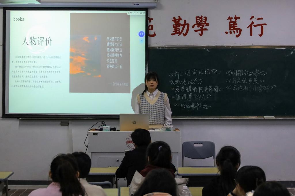 “希望我们可以和主人公一样,怀有迎难而上的勇气和信心,勇敢地去追我们的‘风筝’。与其选择在困境中俯首称臣,不如迎着它继续向前。”在王荣鹃看来,《追风筝的人》中的“风筝”是象征性的,它代表着现实生活中一切美好的事物。“我想通过这本书告知大家,不完美的我们在成长过程中终究能追寻到属于我们的‘风筝’。”为了辅助大家理解,王荣鹃特意制作PPT对该书进行详细介绍。