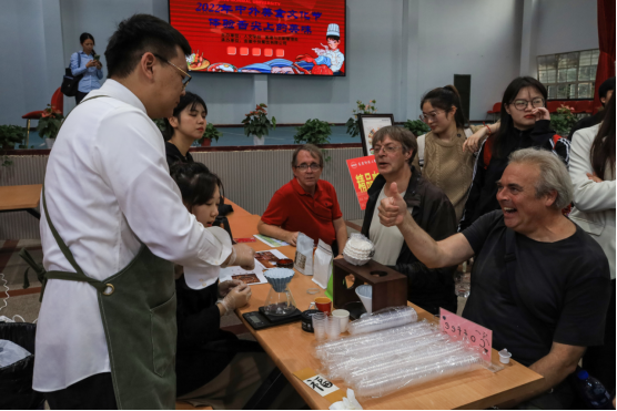 在活动现场的,还有许多外国职工和外籍老师的身影。观看咖啡制作、现场评鉴美食、与在场员工交流互动……来自美国的外籍教师Doug West与其他几位外籍教师在咖啡品鉴区观看制作过程,不时伸出大拇指以示赞叹。