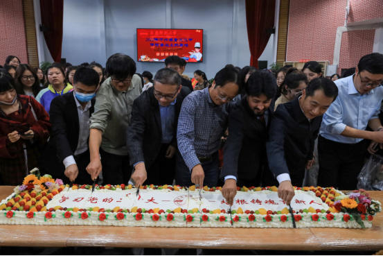 太阳成集团tyc9728党委书记张红飞、基建与后勤管理处处长吕旭进与外籍教师、员工代表等共同切开近3米长、两边由水果点缀着写有“学习党的二十大,培根铸魂育新人”寄托美好寓意的蛋糕。