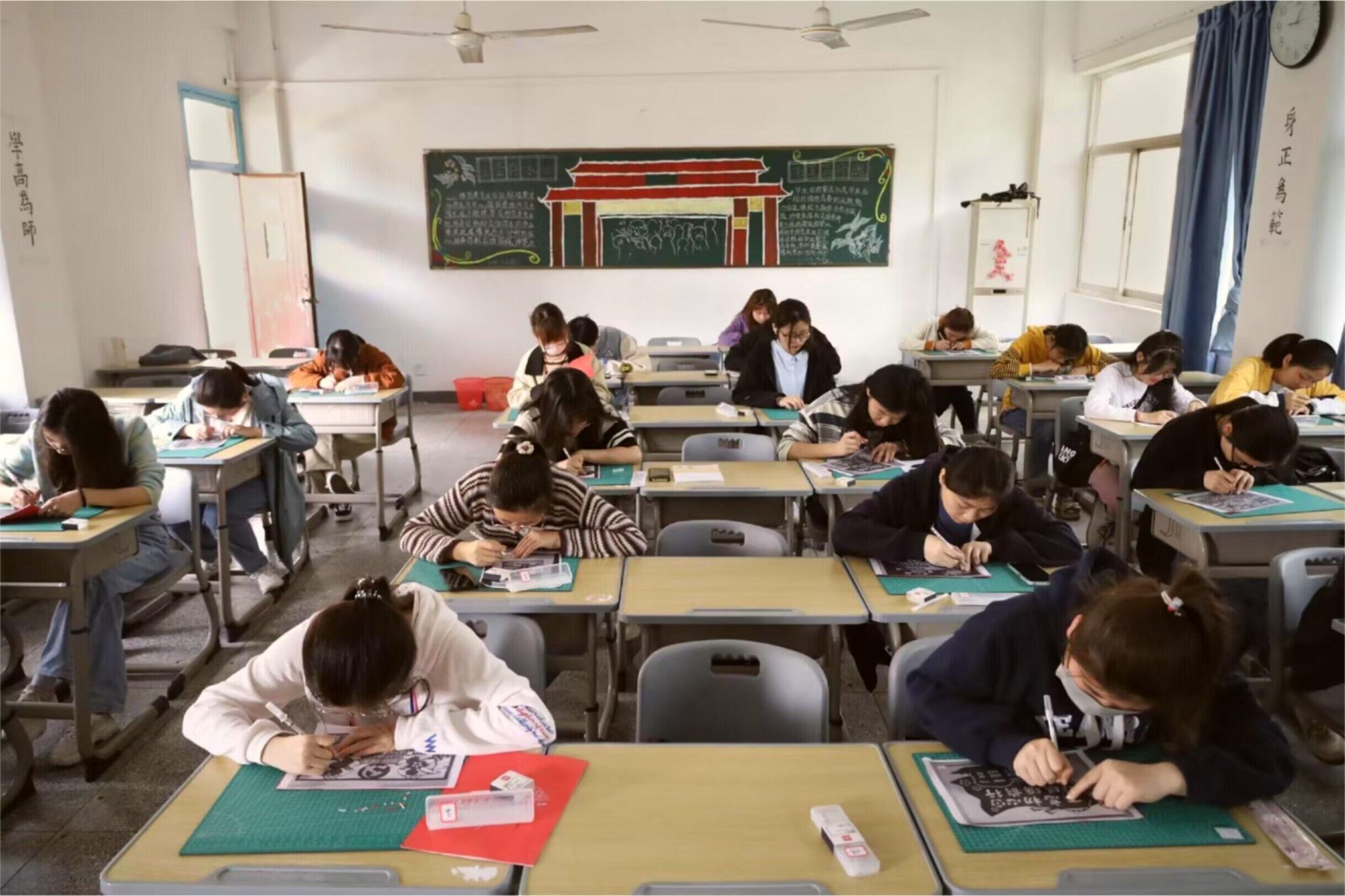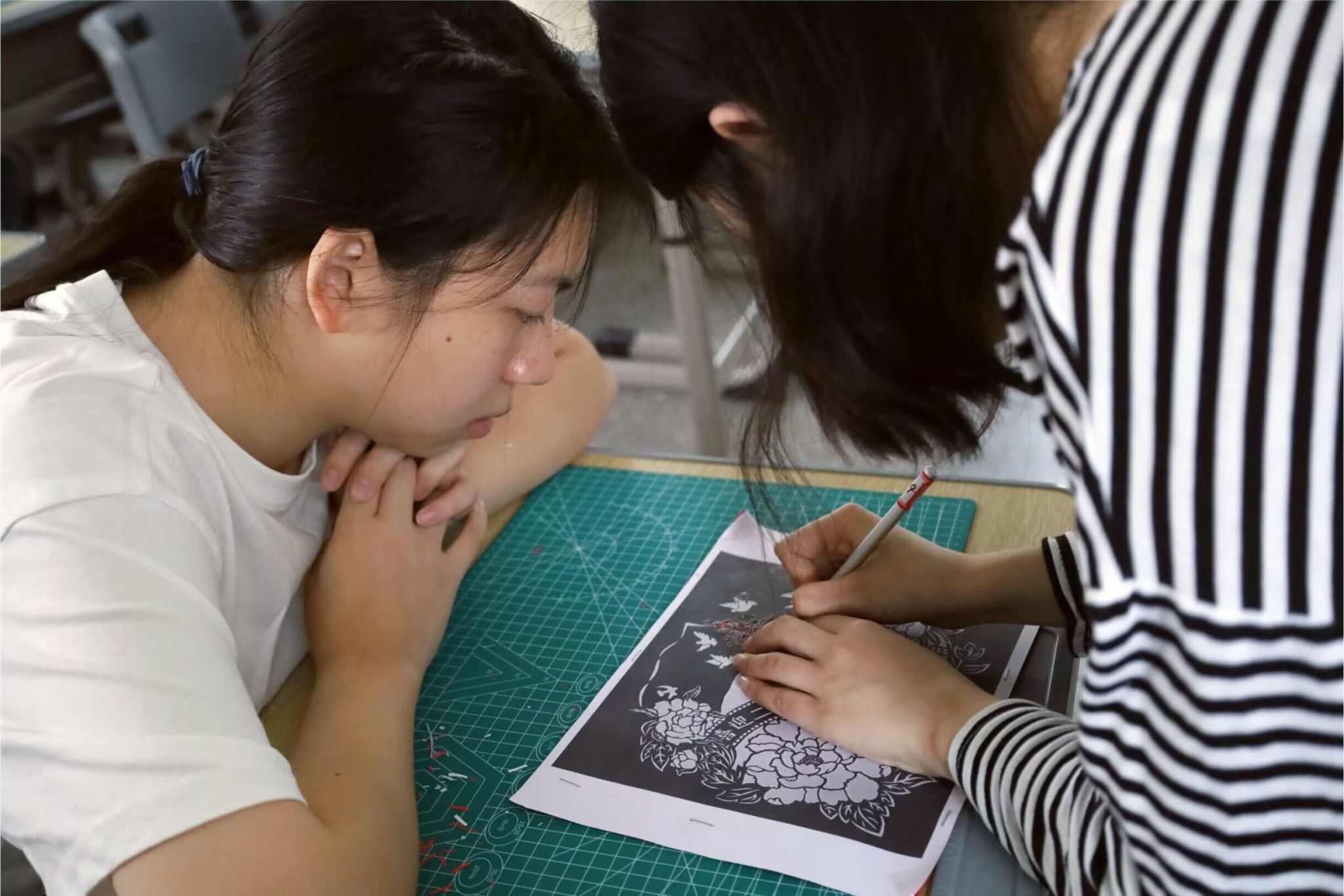 祥云之上,党徽被龙凤衔着的绿叶所环绕;党徽之下,象征着高洁清廉的荷花在恢宏壮阔的天安门广场盛开。雕刻出这样一幅图案精美、寓意吉祥的作品,对于初学者来说并非易事。“祥云上的每一条波浪,都需要缓缓转刀仔细雕刻,稍有不慎卡纸便会磨损。”历史学专业2022(3)班的黄婧斜坐在桌前,小心地掌握着力度,不敢有丝毫的松懈。