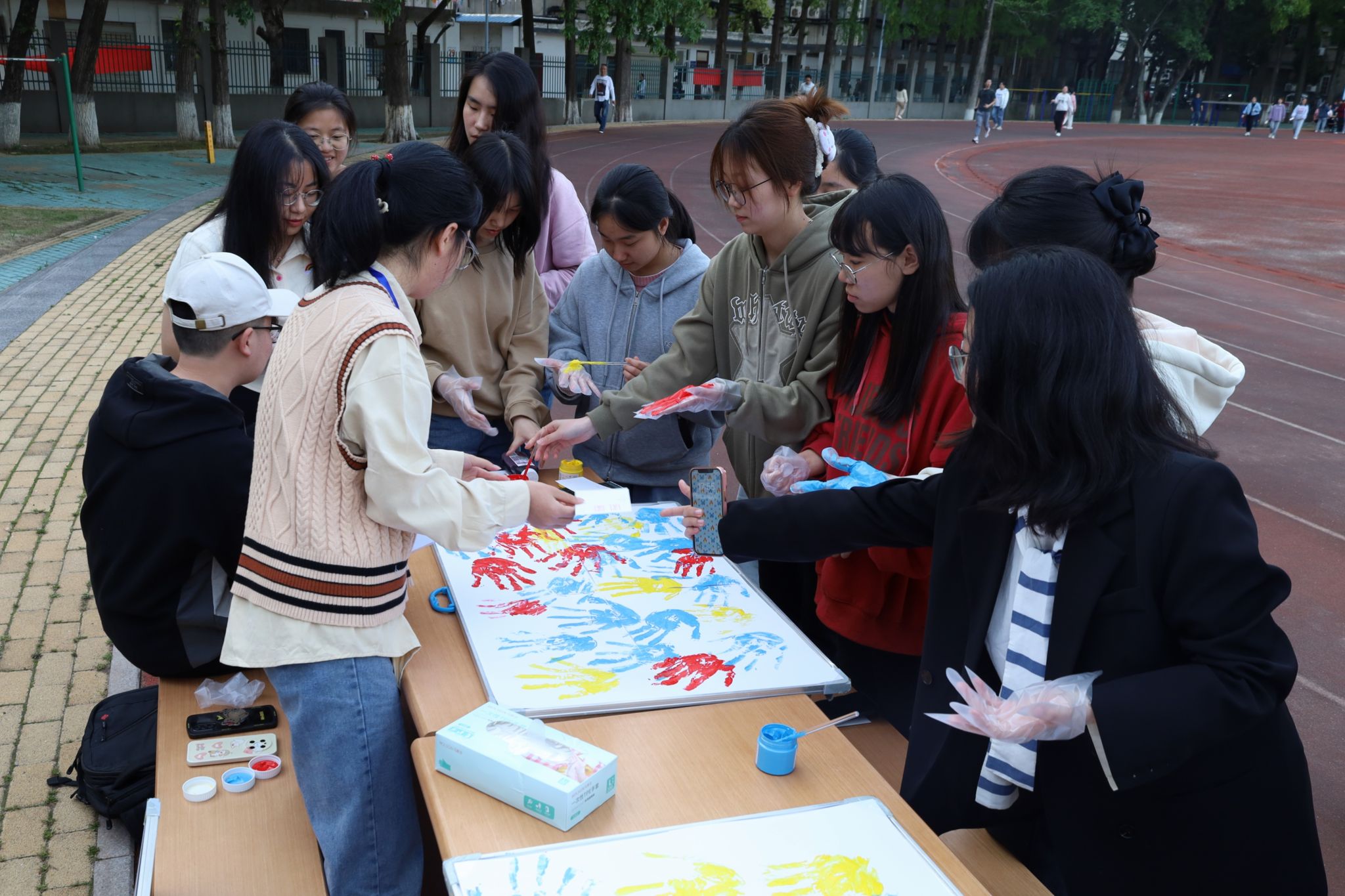 整只手被黄色颜料“包裹”,来自中国语言文学类2022级5班的戴晶晶将手轻轻拍在白纸上,留下一枚独特的黄手印。戴晶晶表示,“活动形式兼具新颖性和趣味性,通过手印画创作,我们能感受到浓厚的青春气息!”据了解,该活动所用的手套与颜料均采用环保材料,在为员工们带去欢乐的同时,不会对环境造成污染。