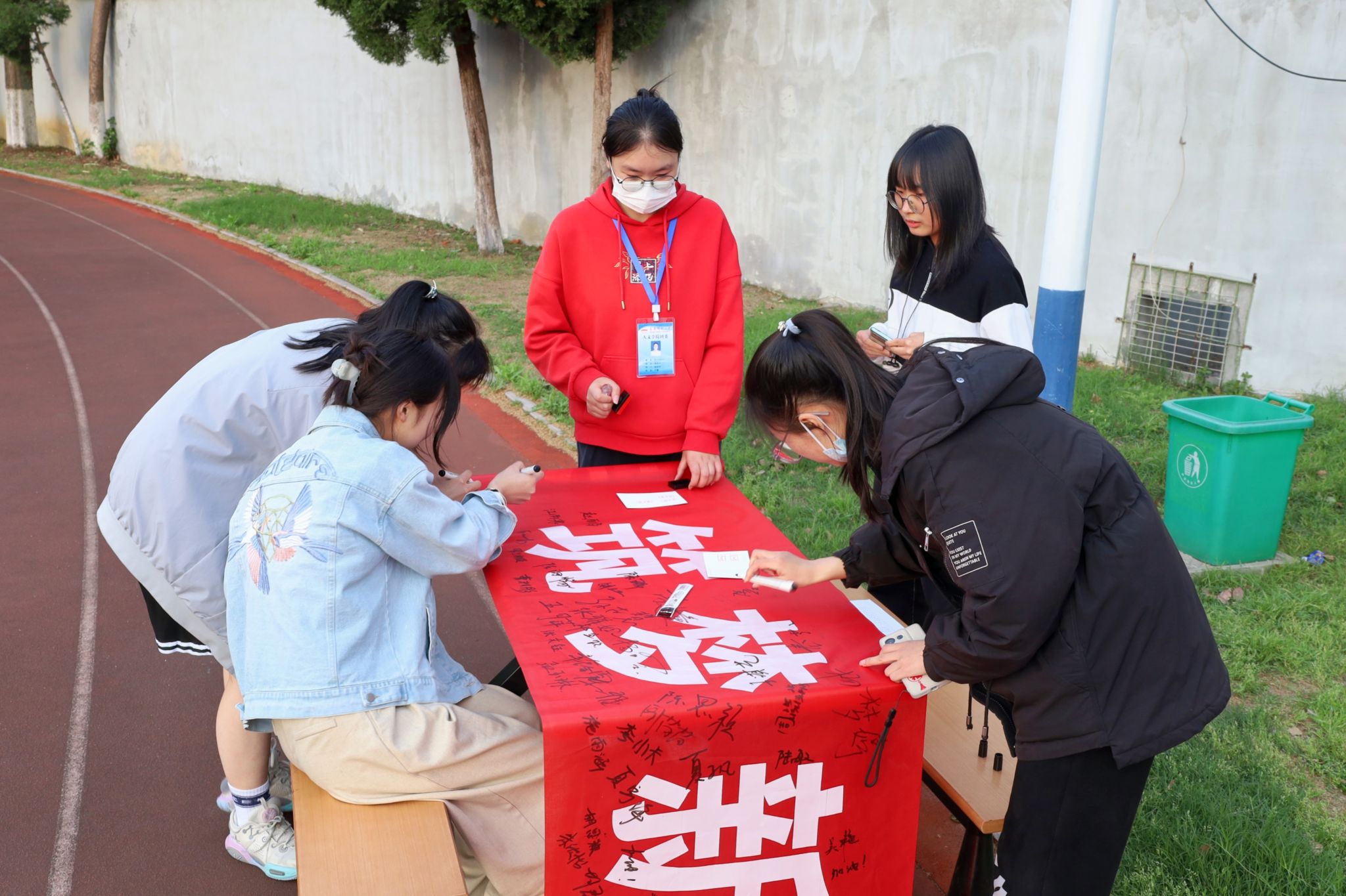 在操场的另一端,两只共青团吉祥物“惊艳亮相”,吸引员工们纷纷前来打卡围观。中国语言文学类2022级5班的李艳萍抱着吉祥物“团团”与“团兔”,摆出不同自拍造型合影留念。“吉祥物寓意着我们青年人团结一心、不懈奋斗的精神品质,不仅展现出我们对未来的憧憬,更启发我们要不断继承与发扬‘五四’精神。”