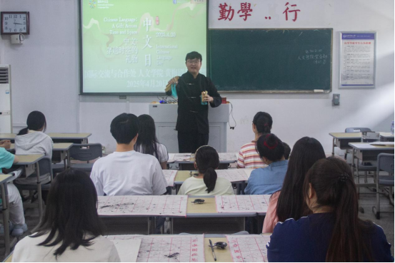 蘸墨调锋、提按转折、收锋回笔……2022级汉语国际教育专业马跃源在书法纸上写下寄寓着美好祝愿的“福”字,拉开了国际中文日的帷幕。她以中文、英语相结合的形式,讲解书法的握笔方式和汉字的笔画规律。来自北非突尼斯的职工马雷克踊跃尝试,在马跃源的指导下,运用毛笔书写“福”字。在这次新鲜的书法体验中,她理解了“福”字的具体寓意,表达对中华优秀传统文化的喜爱和赞美。