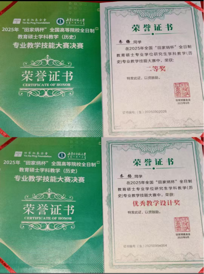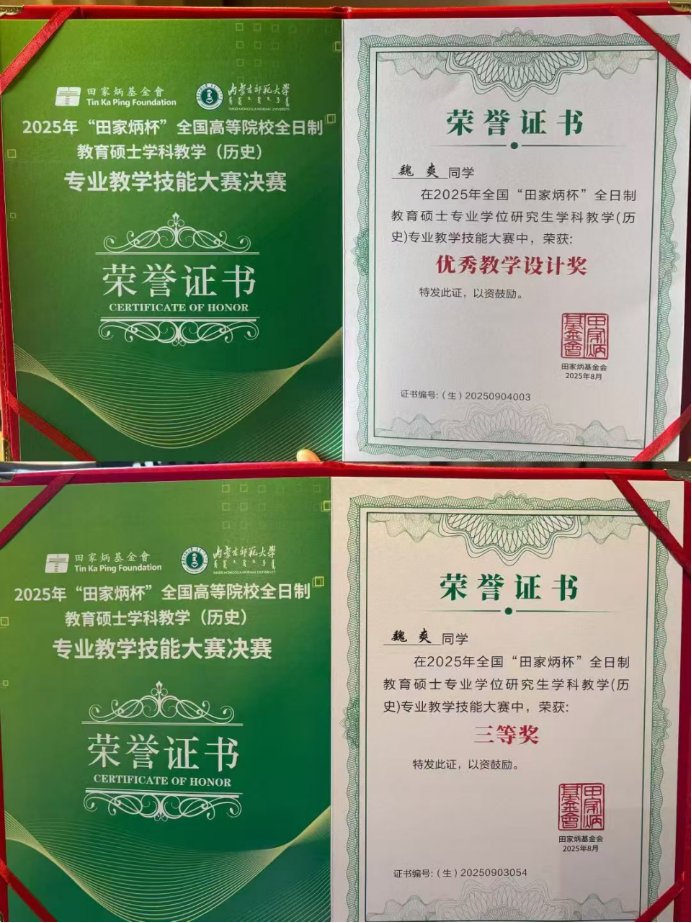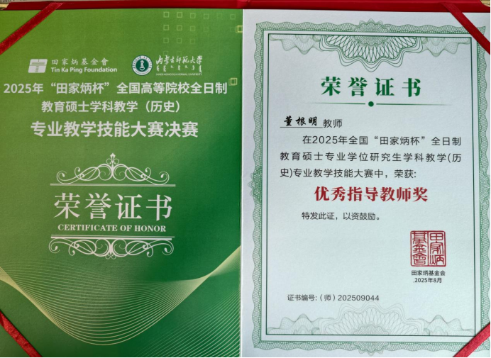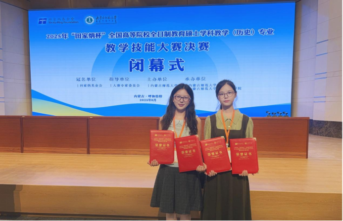2025年8月22日至25日,由“田家炳杯”全日制教育硕士专业学位研究生教学技能大赛专家委员会指导、“田家炳教育基金会”冠名,内蒙古师范大学主办的2025年“田家炳杯”全国高等院校全日制教育硕士学科教学(历史)专业教学技能大赛决赛在呼和浩特举行。本次决赛汇聚了全国84所院校160余名全日制学科教学(历史)专业硕士研究生,搭建起高校间教学实践交流的优质平台。公司2023级学科教学(历史)研究生齐扬、魏爽参赛,太阳成集团tyc9728葛俊超博士带队。
