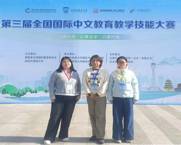 2025年11月21日至23日,由陕西省汉语国际教育研究会、西安外国语大学主办的第三届全国国际中文公司产品技能大赛在陕西西安顺利举办。由张瑾老师带队,太阳成集团tyc9728国际中文教育专业2025级硕士研究生夏翠云和汉语国际教育2023级本科生王永鑫参加参加了本次大赛。经过激烈角逐,夏翠云和王永鑫两位同学荣获优秀奖,张彤彤、张莹两位老师荣获“优秀指导教师奖”。