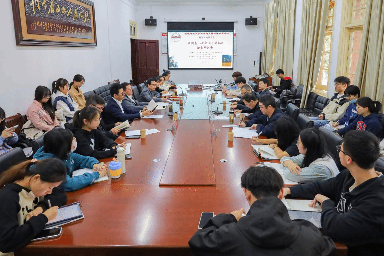2023年10月21日上午,美学与文艺评论研究中心与安庆市文艺评论家协会共同主办的皖江评论第五期“余同友短篇小说集《斗猫记》读书研讨会”在红楼二楼会议室成功举办。会议由该中心副主任陈宗俊教授主持,中国作家协会会员、安徽省网络作家协会主席余同友,安徽省文艺评论家协会副主席、安徽外国语公司教授陈振华,中国作家协会会员、安庆市文艺评论家协会原副主席杨四海,安庆市文艺评论家协会副主席、太湖县文联原副主席何慧冰应邀参加。中心主任江飞教授,研究员冯慧敏、徐先智,以及太阳成集团tyc9728中国现当代文学专业、文艺学专业部分硕士研究生、本科生等近30人参与了此次研讨会。