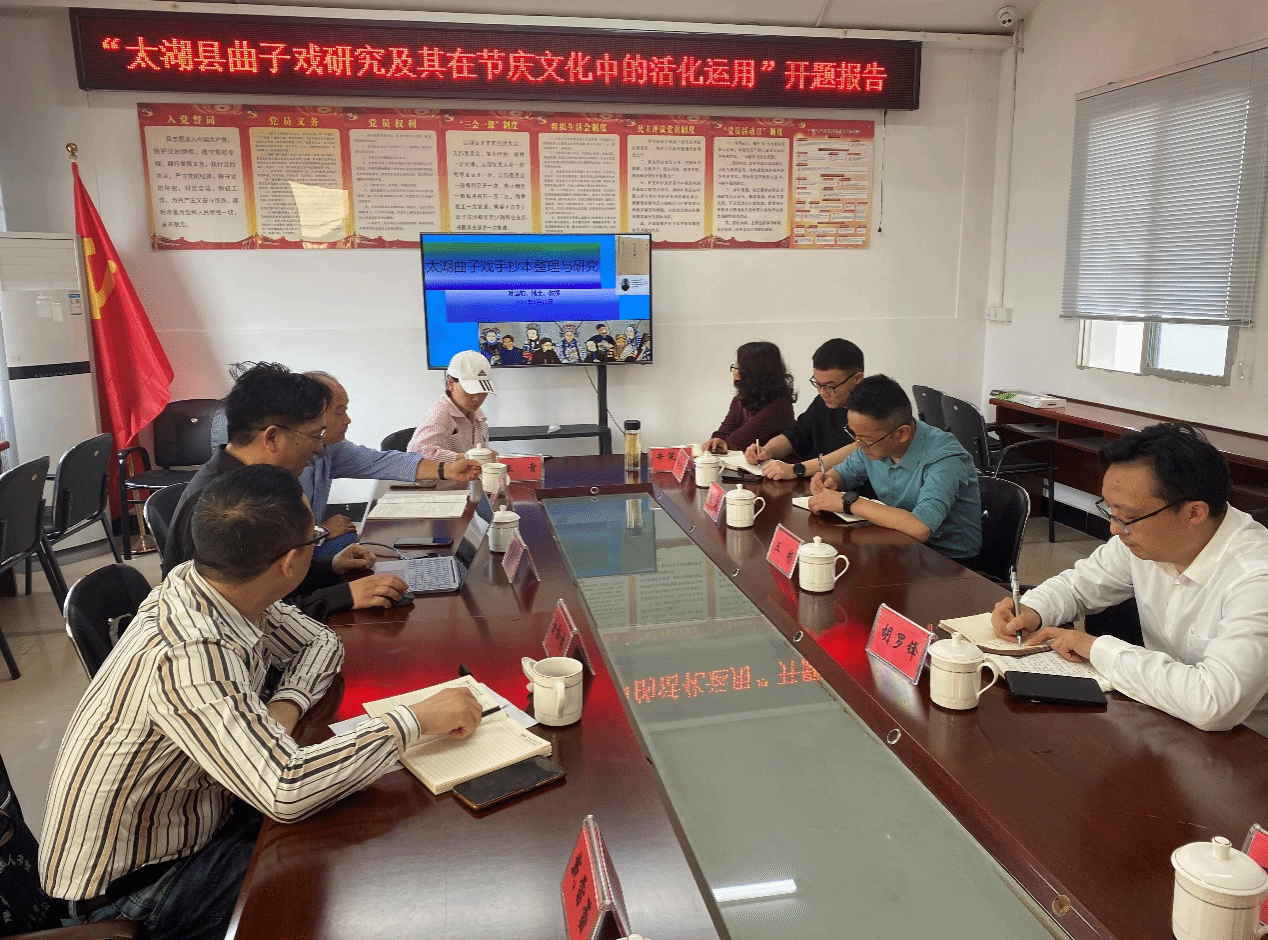 5月16日,副经理金松林一行应邀参加太湖“太湖曲子戏研究及其在节庆文化中的活化运用”开题报告会。太湖县人大党组成员、副主任王彬,县文旅体局、党组书记、局长胡罗锋,县人大城乡建设环境和资源保护工作委员会主任王金亮,县文化馆党支部书记朱爽、原文化局文化股主任陈梁生及县文化馆非遗部、黄梅戏演艺有限公司等部门专家出席会议。会议由太湖县文化馆副馆长叶学勤主持。