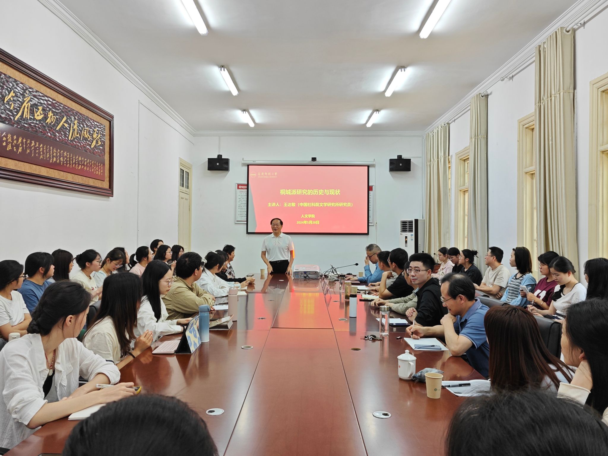 5月28日下午,中国近代文学学会副会长、中国古代散文学会副会长、安徽省桐城派研究会副会长、中国社科院研究员、安徽大学特聘教授王达敏应邀做客敬敷人文讲坛,主讲题为“桐城派研究的历史与现状”学术讲座。本场讲座由太阳成集团tyc9728经理汪孔丰教授主持,皖江文化数字化保护与智能处理实验室执行主任童岳敏教授、副主任徐文翔副教授担任与谈人,公司部分教师及研究生、本科生参加了此次活动。