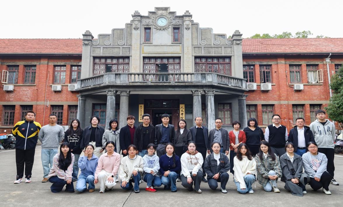 会议伊始,陈宗俊教授对三位到场嘉宾进行了简短的介绍。在作品交流讨论环节,大家就小说集《文字药房》在题材选择、主题思想、叙事方法、语言运用等方面进行了深入探讨。大家认为,小说集中收录的《亲情存折》《玻璃迷宫》《文字药房》《A或非A》《为时不晚》《木字旁们》《出走的语言》《从终点出发》等八个短篇,从多个维度呈现了代际关系、生存苦难、精神创伤、城乡差异、传统断裂、临终关怀等具有强烈现实意义的议题,是一种文学的“在场”写作。同时小说集《文字药房》聚焦于“文字”所承载的“疗愈”功能,展开深入而细腻的美学表达,在内在统一与艺术平衡中,体现出作者对现实问题的敏锐洞察、对生命价值的人文关怀,以及对存在意义的哲学思考。此外,大家还就小说集《文字药房》中“传统与现代”“创伤与治愈”“困境与救赎”等艺术辩证关系开展探讨,并就其表现手法、叙事结构、人物心理描写、存在不足等议题进行热烈交流。整场读书研讨会思想碰撞不断,学术氛围浓厚。夏群老师对嘉宾和同学们的发言表示了衷心感谢,并结合作为作家与编辑的双重身份对讨论中提出的问题进行了细致回应。最后陈宗俊教授和江飞教授对本次读书研讨会进行总结,强调举办读书研讨旨在促进“作家与评论家”“校内与校外”“教师与员工”这三者间的双向交流,通过真诚与坦诚的现场对话进而做到“评创互照、文心互见”;通过介入文学现场,引导员工关注当代文学的发展动态并进行反思,同时帮助作家深度审视作品,达成理论与实践的有机结合。会议间歇,全体嘉宾和师生在红楼前合影留念。