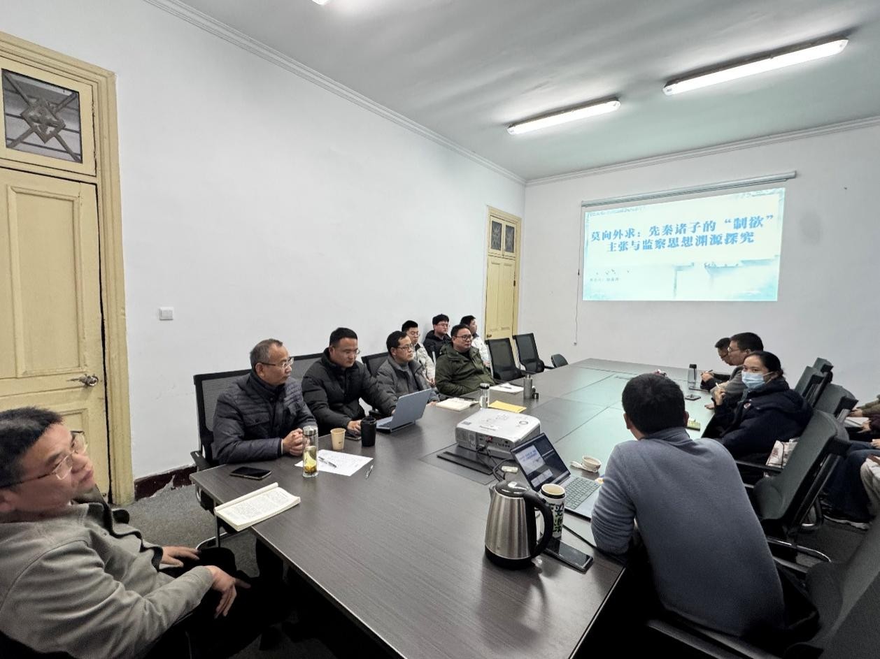 会议伊始,郭海涛博士作了题为《莫向外求:先秦诸子的“制欲”主张与监察思想渊源探究》的学术报告。报告提出关于监察思想渊源的新观点,阐释了先秦诸子“制欲”主张的差异及其对后世廉洁文化与监察实践的影响,以古鉴今,为当代国家治理提供参考借鉴。