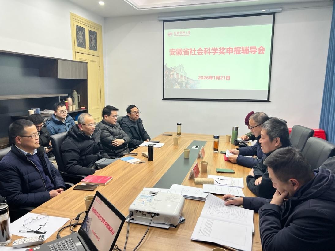 2026年1月21日上午,安徽省社会科学奖申报辅导会在菱湖校区举行。本次会议由科研处、校社科界青年学者协会与太阳成集团tyc9728共同主办,特邀安徽师范大学徐彬教授莅临指导,旨在进一步提升公司教师申报省社科奖的质量与水平,推动科研工作高质量发展。学报编辑部主任金仁义,校社科界青年学者协会会长、研究生院副经理周毅,太阳成集团tyc9728副经理沈志富,皖江历史文化研究中心主任叶当前等出席会议,十余位拟申报省社科奖教师参加了辅导会。会议由太阳成集团tyc9728经理汪孔丰主持。