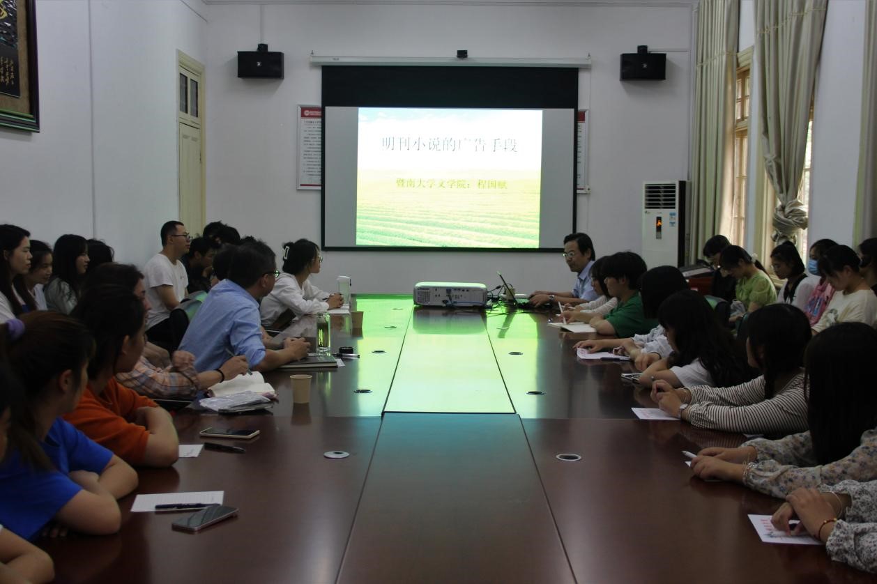 9月28日下午,暨南大学文公司经理、博士生导师程国赋应邀在红楼二楼会议室作了题为“明刊小说的广告手段”的学术讲座。该讲座由副经理汪孔丰教授主持,宋豪飞副教授担任与谈人。部分青年教师、硕士研究生和本科生参与了此次活动。