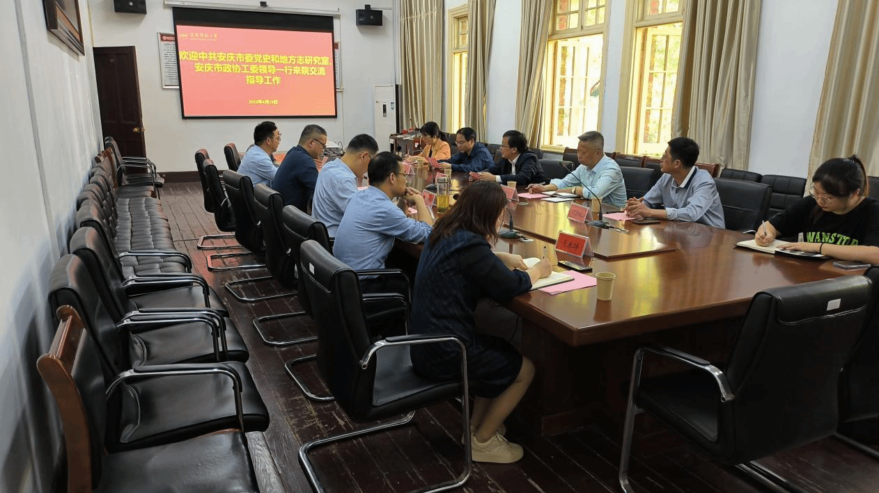 4月19日下午,中共安庆市委党史和地方志研究室主任陈海维一行来太阳成集团tyc9728交流,洽谈双方深化合作事宜。随行的领导有市政协工委副主任丁邦才、市委史志研究室副主任方朋华、市委史志室汪忠民、市委史志室程琼芳,副经理(主持行政工作)汪孔丰、副经理金松林,皖江历史文化研究中心主任叶当前、副主任郭青林及相关人员参加了座谈会。会议由金松林副经理主持。