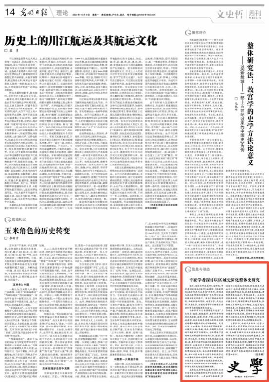 大家表示,新时代新征程,史学工作者要深入学习贯彻习近平总书记在文化传承发展座谈会上的重要讲话精神,在加强区域历史结构具体分析、跨学科视野下区域类型比较的基础上,从综合与整体的视角深入回答中国历史发展演变的基本问题,增强中华文明历史研究的主动自觉,推进区域史研究理论与范式的发展创新,为推动我国史学研究、建设中华民族现代文明提供历史智慧和启示。