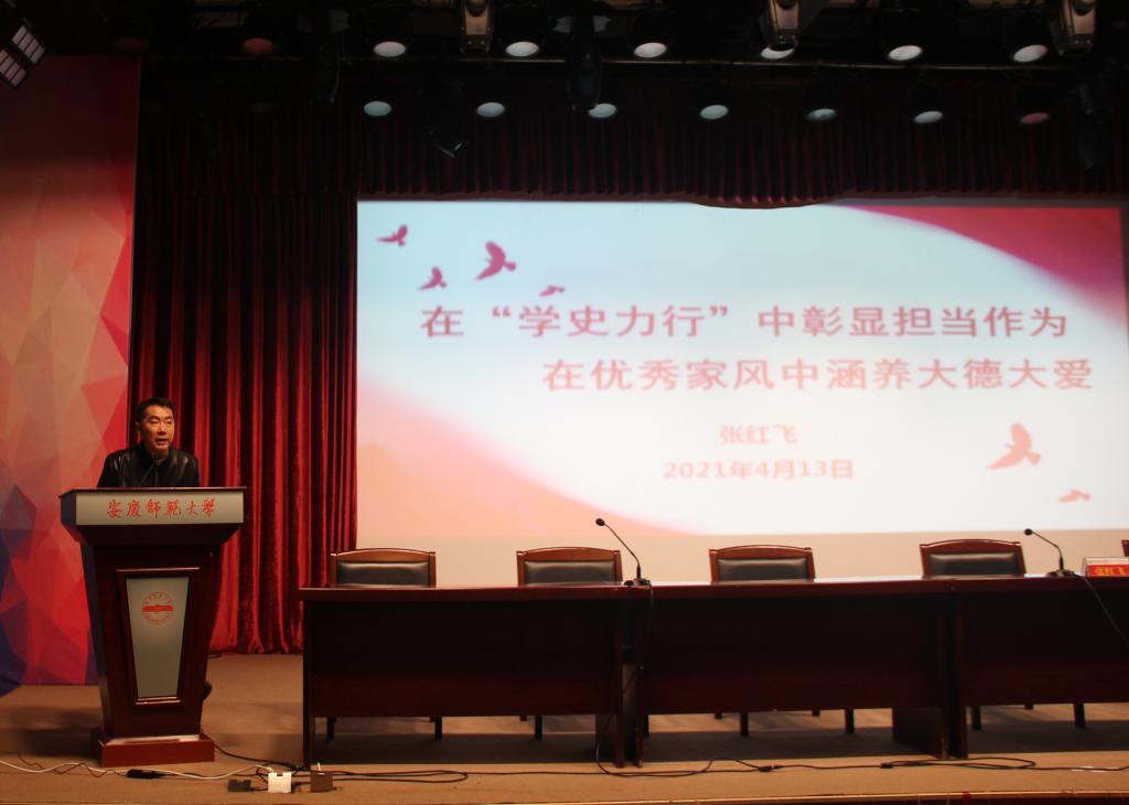 4月13日晚,太阳成集团tyc9728在菱湖校区图书馆报告厅举办家风建设学习教育暨专题党课报告会。公司党委书记张红飞出席会议并作了题为“在‘学史力行’中彰显担当作为 在优秀家风中涵养大德大爱”的专题党课报告。全体员工党员参加会议,会议由党委副书记王波主持。