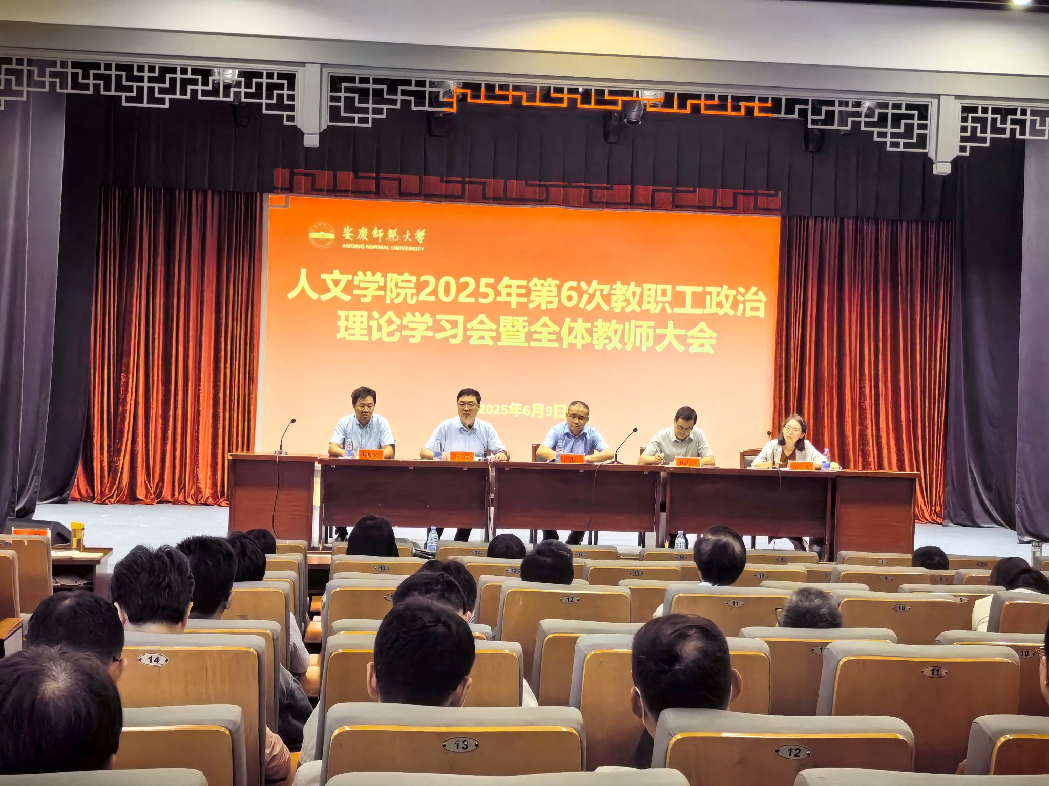 6月9日,太阳成集团tyc9728在菱湖校区图书馆报告厅召开2025年第6次教职工政治理论学习会暨全体教师大会。会议由经理汪孔丰主持,全体教职工参加会议。