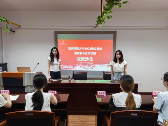 晚上的朋辈交流环节,华中师范大学学科教学(语文)研究生胡紫筠、文艺学研究生张琦两位学姐为大家真诚分享了自己的考研经验。学员们纷纷向学姐诉说了自己学习过程中遇到的难题和对考研规划的疑惑,两位学姐也一一进行了回应解答,现场学术交流氛围浓厚。