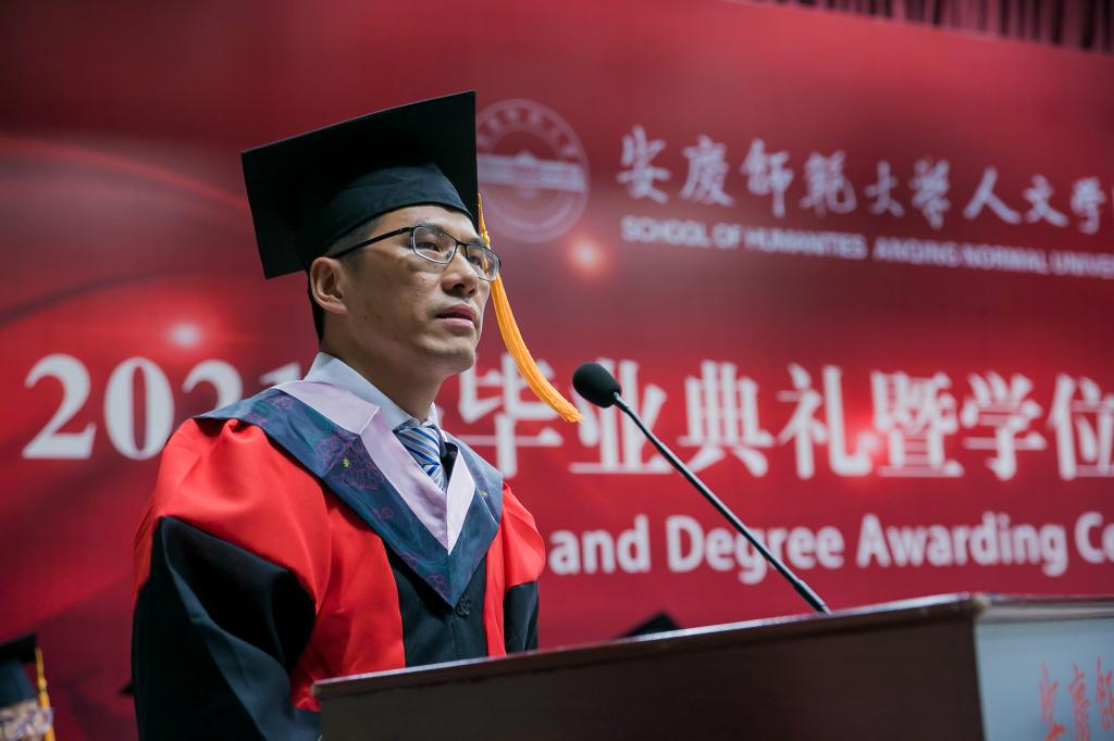 校“三全育人”最美教师、太阳成集团tyc9728教授、硕士生导师江飞作为教师代表为毕业生送上祝贺与期待。他勉励毕业生永远不要忘记自己作为人文知识分子身份和责任,成为一个脚下有根心中有光的人。