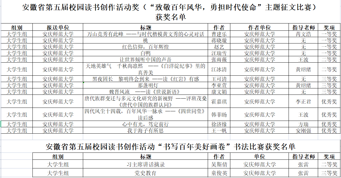 近日,省教育厅公布安徽省第五届校园读书创作活动获奖名单,人文学院学子喜获佳绩,共收获各类省级奖项15项(含主题征文比赛13项、书法比赛2项),其中一等奖4项、二等奖3项、三等奖4项。