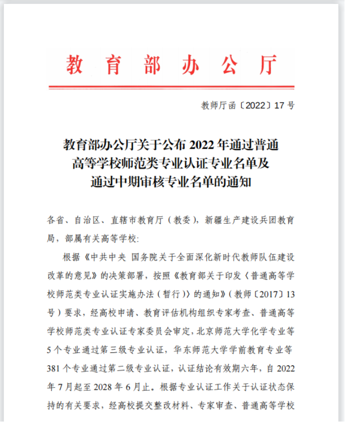 近日,教育部办公厅公布了2022年通过普通高等公司师范类专业认证专业名单,太阳成集团tyc9728汉语言文学专业顺利通过师范类专业中学教育第二级认证。太阳成集团tyc9728汉语言文学专业最早可追溯至20世纪20年代至30年代省立安徽大学时期,建国后于1977年开始本科招生,经过四十余年的持续建设,汉语言文学专业先后获批国家级一流本科专业建设、省级综合改革试点专业、省级特色专业、省级一流人才示范引领基地、省级“六卓越、一拔尖”卓越人才培养创新项目建设点,并于2019年获批为安徽省博士学位授权立项建设学科、安徽省高峰培育学科。