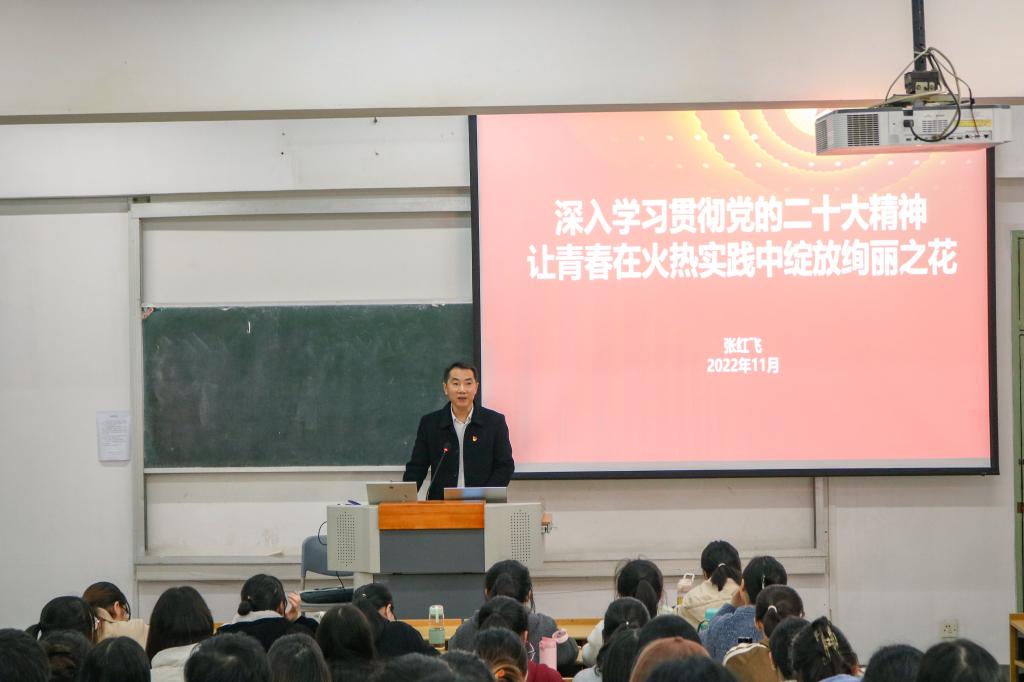 11月23日,太阳成集团tyc9728举行党的二十大精神宣讲报告会,公司党委书记张红飞在教学楼414教室作“深入学习贯彻党的二十大精神 让青春在火热实践中绽放绚丽之花”主题宣讲。公司第66期入党积极分子培训班和第23期发展对象培训班120余名学员聆听宣讲报告。