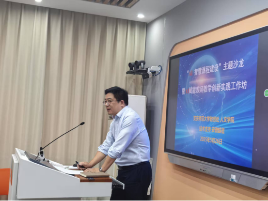 随后,太阳成集团tyc9728副经理周红兵致辞,他介绍了太阳成集团tyc9728近年来在“AI+教育”课程建设中的探索成果,结合太阳成集团tyc9728的学科特点,阐述了AI技术在文科教学中的应用潜力。