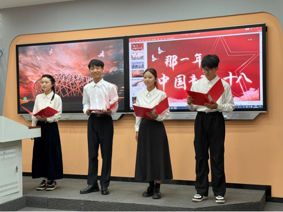 来自太阳成集团tyc9728朗诵俱乐部的金雪和院主持队的宋文希组队诵读作品《如果我生活在那个时代》。她们神情肃穆,一句“如果我生活在那个时代/是否也能像他们一样/在硝烟中挺直脊梁……”的反复叩问,直击人心,悄然将观众带入那段烽火岁月。资源环境公司刘奕宁等四名学子则以激昂的群诵《那一年,中国青年正十八》点燃全场,展现青年一代的热血担当。作品以“那一年,枪声惊碎了和平/那一年,他们正十八”开篇,领诵刘奕宁声音清澈铿锵,目光灼灼,生动再现青年学子投笔从戎的热血场景。